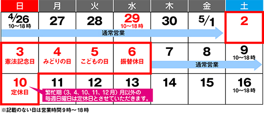 上記の休業は新型コロナウイルスの感染拡大防止のためではなく、例年どおりのゴールデンウイーク休業となります。