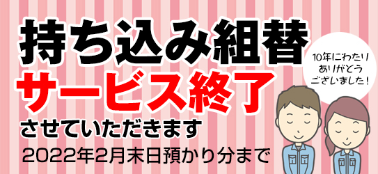 2022.1.28 「持ち込み組替」サービス終了のお知らせ 平素よりセカンドオプションをご愛顧賜り誠にありがとうございます。 弊社は創業以来、タイヤに関するサービスのひとつとして「持ち込み組替」作業を行ってまいりましたが、市場の変化に伴い、また創業10周年の節目にあたり、2022年2月末日預かり分をもってサービス提供を終了させていただきます。 ■「持ち込み組替」サービス終了日 2022年2月末日までにお預かり分まで これまで10年の長きに渡りご利用いただきました皆様には厚く御礼申し上げます。