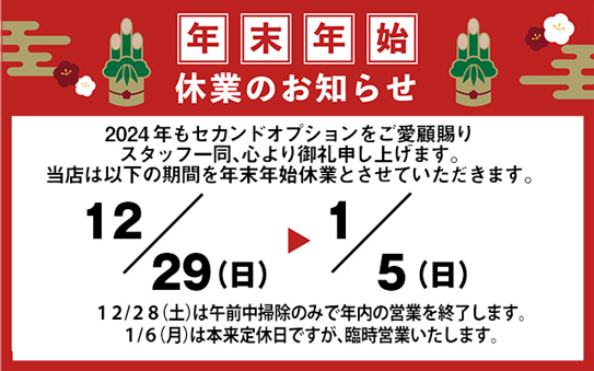 当店は2024年12月29日(日)~2025年1月5日(日)を年末年始休業とさせていただきます。新年の営業は1月6日(月)からとなります。